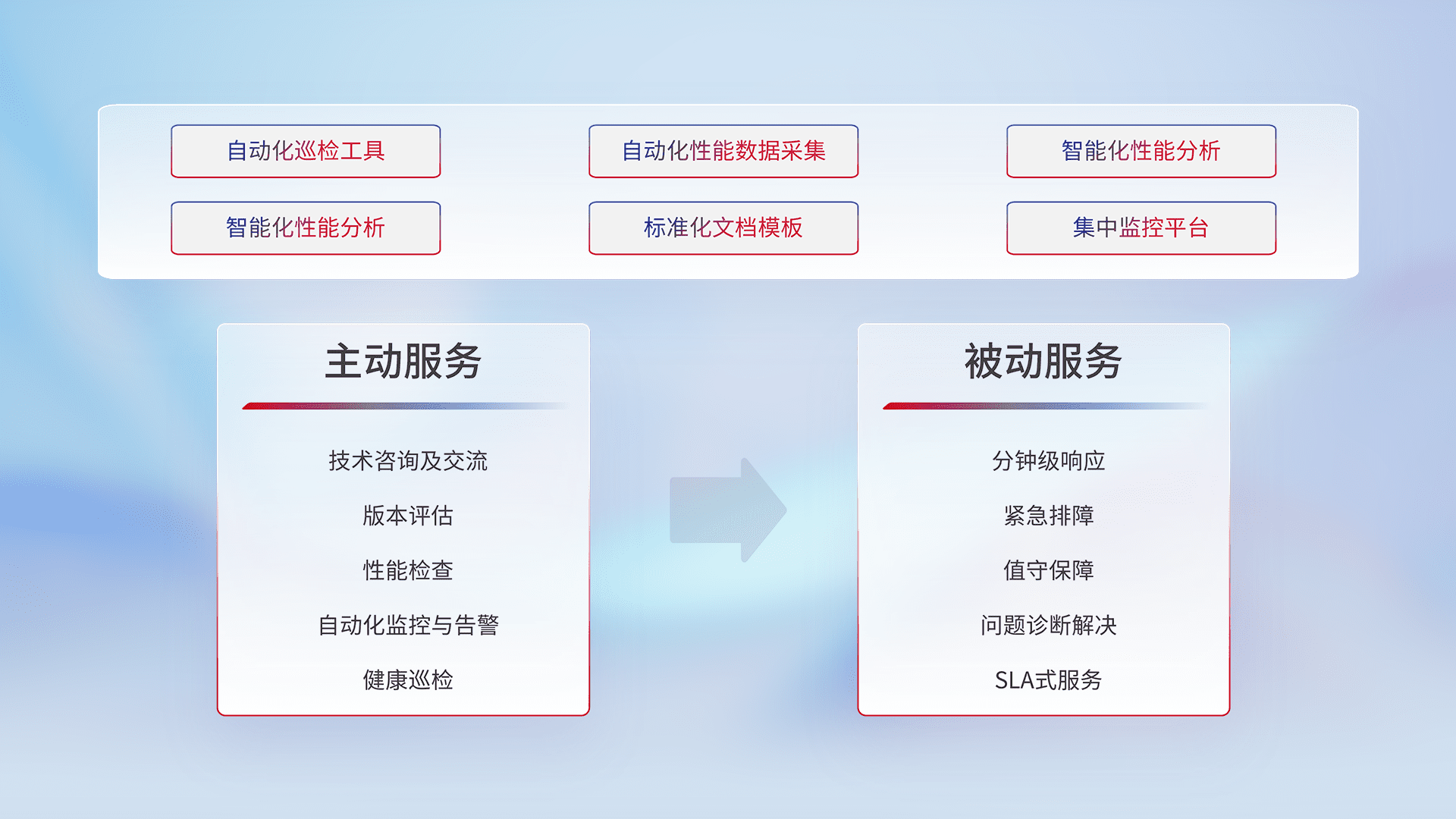智能化工具和标准化文档,,,保障服务质量,,提供主动服务(包含技术咨询、、、、版本评估、、、、性能检查、、自动化监控与告警、、、健康巡检)和被动服务包含(分钟级响应、、、、紧急排障、、、值守保障、、、问题诊断解决、、、SLA服务)。。